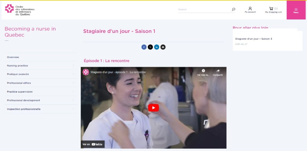 La orden de enfermería de Quebec produjo una serie denominada «Stagiaire d’un jour» donde puedes conocer un poco más del trabajo de cada profesional de enfermería en diferentes ámbitos, consta de 3 temporadas: Temporada1 , temporada2 y temporada3 donde narra la serie de capítulos de enfermería en diferentes aspectos de sus quehaceres diarios.